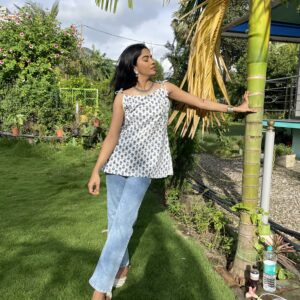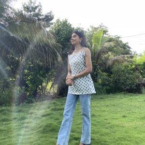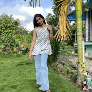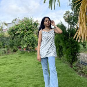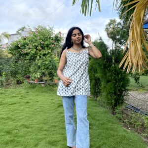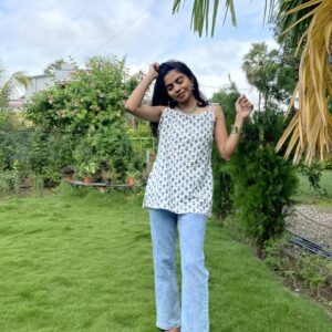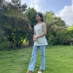 Be the first to review “Elegant white kurti with delicate blue prints, straight fit and simple neckline”